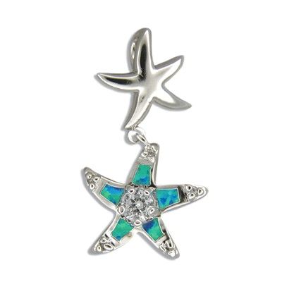 Sterling Silver Blue Opal Starfish Floating Pendant with CZ. 1' by 3/4' with Ocean Blue Opal Inlay & CZ set on the larger Starfish. This pendant is made with sterling silver and finished with Rhodium to avoid tarnishing.
