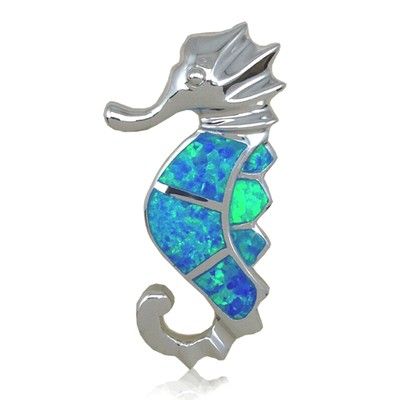 Sterling Silver Hawaiian Fancy Seahorse Shaped Blue Opal Slide Pendant. 3/4' in width , 1 3/8' in length with Blue Opal Inlay and Rhodium finished to avoid tarnishing. Always appropriate and gorgeous, this pendant is a timeless classic, and it belongs in every jewelry wardrobe.
