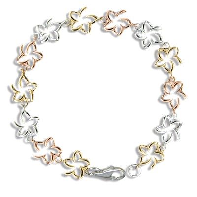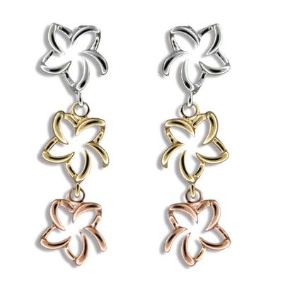 Sterling Silver Hawaiian Tri-color Open Plumeria Dangling Pierced Earrings. There are three Open Plumeria on each side. Each Plumeria is 3/8' in diameter. Total lengh is 1 1/4' with Rhodium finished to avoid tarnishing.