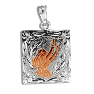Kahiko Collection - Sterling Silver Rose Gold Coated Kahiko Moon Light Hula Dancer Pendant. This pendant is 1" by 1" and finished with 14kt Rose Gold. By mixing of traditional Hawaiian Hula Dancing themes and Hawaiian Jewelry engraving techniques, a unique Hula Jewelry collection was created. Kahiko Collection is made with solid Sterling silver and Rhodium finish to avoid tarnishing. In addition, Kahiko Collection has copyrighted authenticating trademark on the backside of each design. The trademark is laser engraved on every design permanently to guarantee originality.