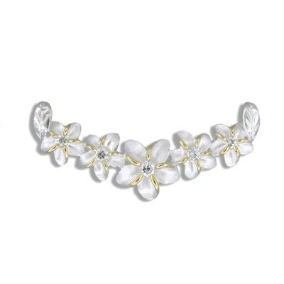 Sterling Silver 6MM Cut-Out Two Tone Hawaiian Plumeria Ring with Clear CZ. Each Hawaiian Plumeria Flower is 1/4" diameter with brush finished and finished with 14kt yellow gold coating on the petals. Size 4-10 are available.