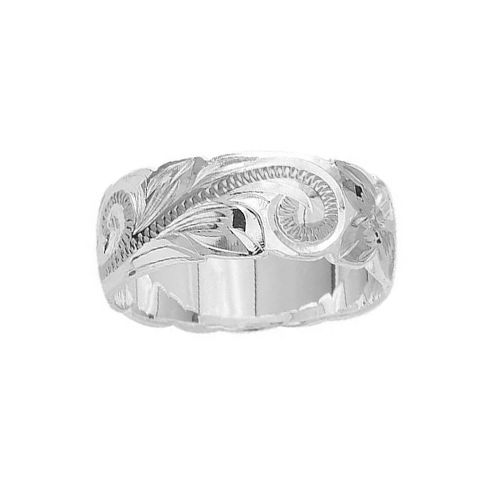 Sterling Silver 8MM Hawaiian Plumeria and Scroll Ring with Cut-Out Edge. The 8mm ring is made with sterling silver and high polished to avoid tarnishing. Size 4.5-13 are available.
