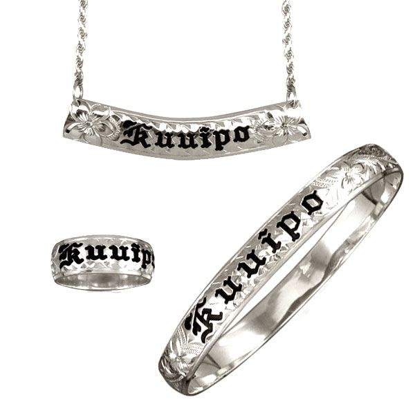 Hand carved in Hawaii with Aloha. 1.75mm in thickness. Available in 6mm, 8mm and 10mm. Set of 3 includes a bangle, ring and necklace