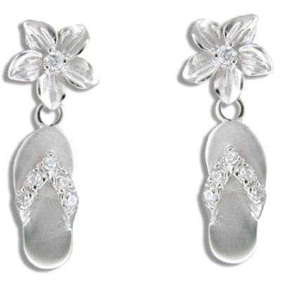 Sterling Silver Hawaiian 10mm Plumeria and Slipper Dangling Pierced Earrings. Each hand carved slipper has 5 CZ set on the strap. Each Plumeria is 3/8" in diameter. Total length is 1 1/16" with Rhodium finished to avoid tarnishing.