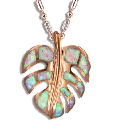 Sterling Silver Hawaiian Monstera Leaf Pink Opal Pendant 1" by 1" with Pink Opal Inlay. This pendant is made with sterling silver and finished with 14kt Rose Gold to avoid tarnishing.