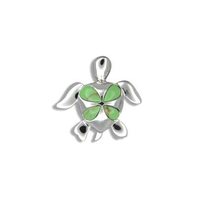 Sterling Silver Hawaiian Green Turquoise Heart Sea Turtle Honu Bracelet. There are hand carved and polished Heart shape Green Turquoise on each Sea turtle. In addition, this bracelet is finished with Rhodium to avoid tarnishing. Total length is 7.25".
