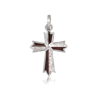 Sterling Silver Hawaiian Koa Wood 2 Side Engraved Fish Hook Pendant. 1/2" in width and 7/8" in length with Hawaiian Koa Wood Inlay. Total length is 1 1/16". This hand carved with scroll design pendant is made with sterling silver and finished with Rhodium to avoid tarnishing.