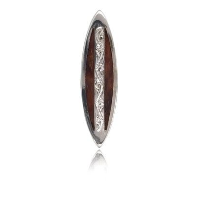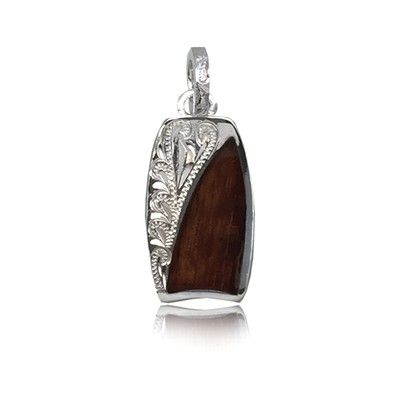 Sterling Silver Hawaiian Koa Wood Engraved Cross Shaped Pendant (L). 1" in width and 1 3/4" in length with Hawaiian Koa Wood Inlay. Total length is 1 5/8". This pendant is made with sterling silver and finished with Rhodium to avoid tarnishing.