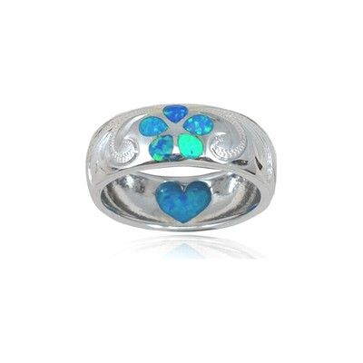 Sterling Silver Hawaiian Plumeria and Heart Design Blue Opal Ring. There are Plumeria and Heart shaped Blue Opal set on the ring. Size 5-10 are available.
