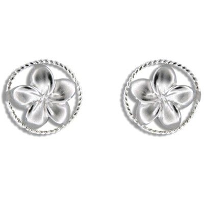 Sterling Silver Hawaiian Plumeria in Circle Design Pierced Earrings