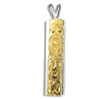 Sterling Silver Two Tone Hawaiian Plumeria and Scroll Vertical Pendant. This pendant is 1" by 1/4" and weight about 5.3 grams. In addition, there are Hawaiian Plumeria and Scroll designs carved in the center of the pendant and finished with 14kt Yellow Gold. This pendant is made with sterling silver and high polished to avoid tarnishing.